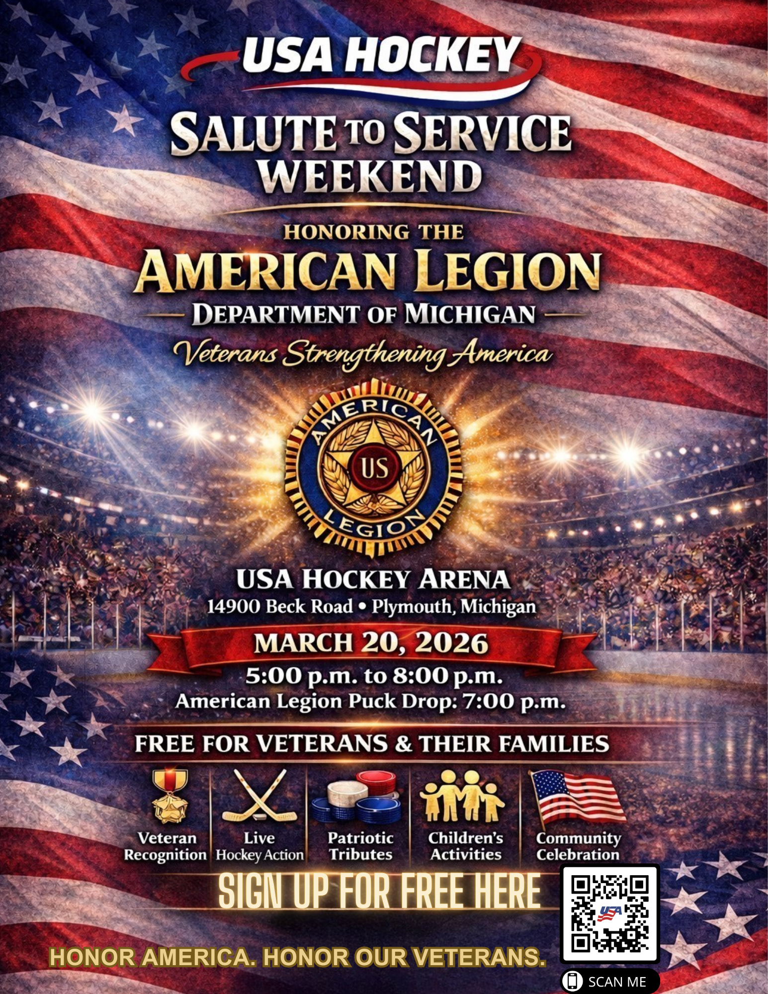 Now in its 15th year, Salute to Service Weekend has become one of Michigan’s largest veteran appreciation events. Each year, thousands gather not just for hockey but to honor those who have worn the uniform and those who continue to serve our communities. This year’s event will also recognize the American Legion Department of Michigan for its ongoing commitment to veterans across the state.